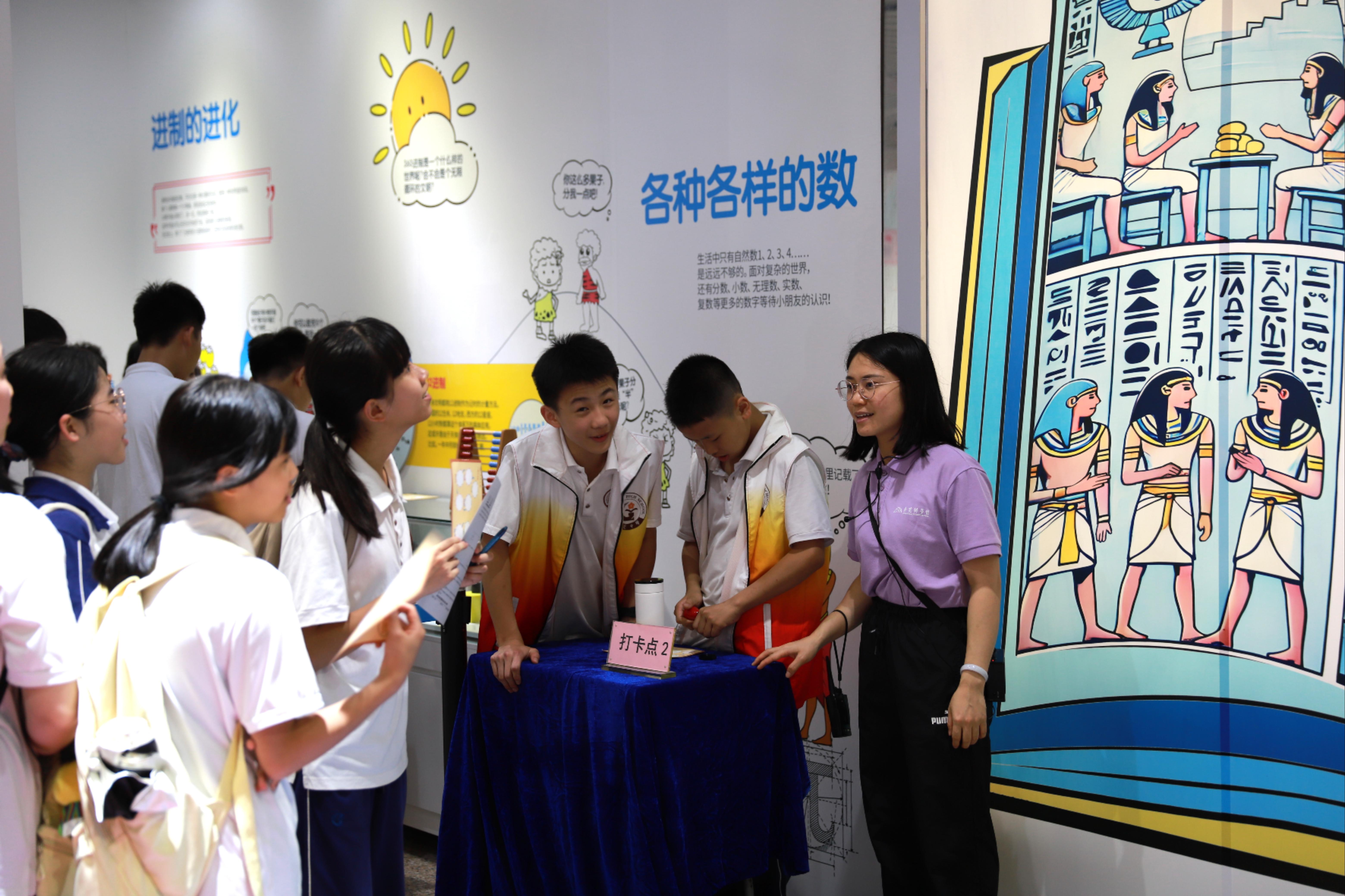 在“从一到无穷∞数学的进化”科普展中,同学们依次闯过了“进制的进化”、“分数的力量”、“数系的扩张”等关卡,在这个过程理解生活中的数学问题,学习选择使用简洁合理的运算策略解决问题。