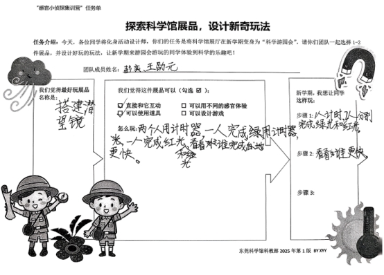 早在暑期启动前,东莞科学馆就和东莞市莞城中心小学达成共识,确定新学期大规模研学新模式——从各班挑选“小小科学辅导员”,带领组员完成研学任务。为确保“小辅导员”具备带队能力,同时探索更贴合儿童需求的研学形式,“感官小侦探系列活动”应运而生,搭起“基础体验——创新实践——方案落地”的培育链条。