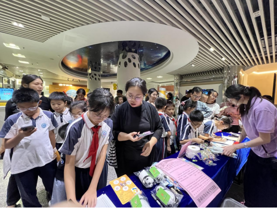 随着挑战的完成,孩子们兴奋地来到一楼展厅前台兑奖。另外,集齐5枚印章的参与者凭打卡“喜迎全运会·科学馆奇妙夜”的九宫格朋友圈以及“全运挑战卡”兑换了全运会吉祥物小奖励。