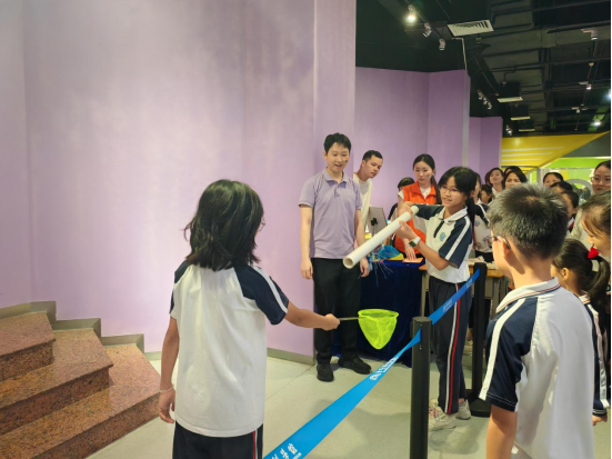 电磁展区——章鱼飞侠处,孩子们两两一组,利用静电原理模拟全运会飞碟运动。一位小女孩专注地用塑料棒与羊毛摩擦,使塑料章鱼悬浮并飞向同伴,对方稳稳地用捕捉网接住章鱼,两人击掌庆祝成功。