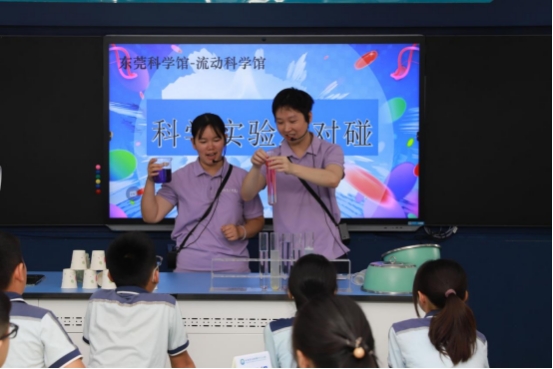 同时,“科学实验对对碰”表演也走进石排镇中心小学,将现场气氛推向高潮。科普辅导员通过有趣的演示和互动,让同学们了解有趣的科学知识。