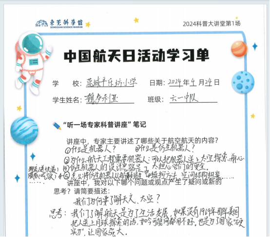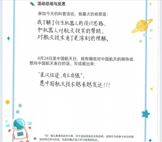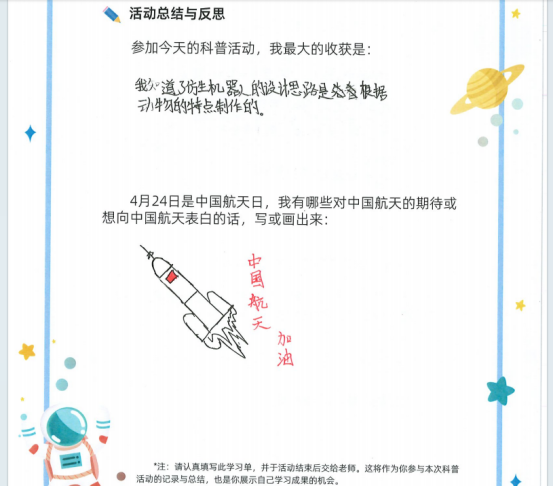 这次航天科普活动,同学们汲取了丰富的航天知识,在实践中锻炼了自主动手和独立思考的能力,提高了对航天科技知识的理解和认识,激发了探索宇宙的热情。