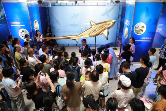 讲座开始前,隋教授在“哇!鲨鱼”展区开展讲解,以深入浅出的方式,揭示了鲨鱼的生存智慧与生态价值,引领观众穿越深海,领略生命的奇迹。